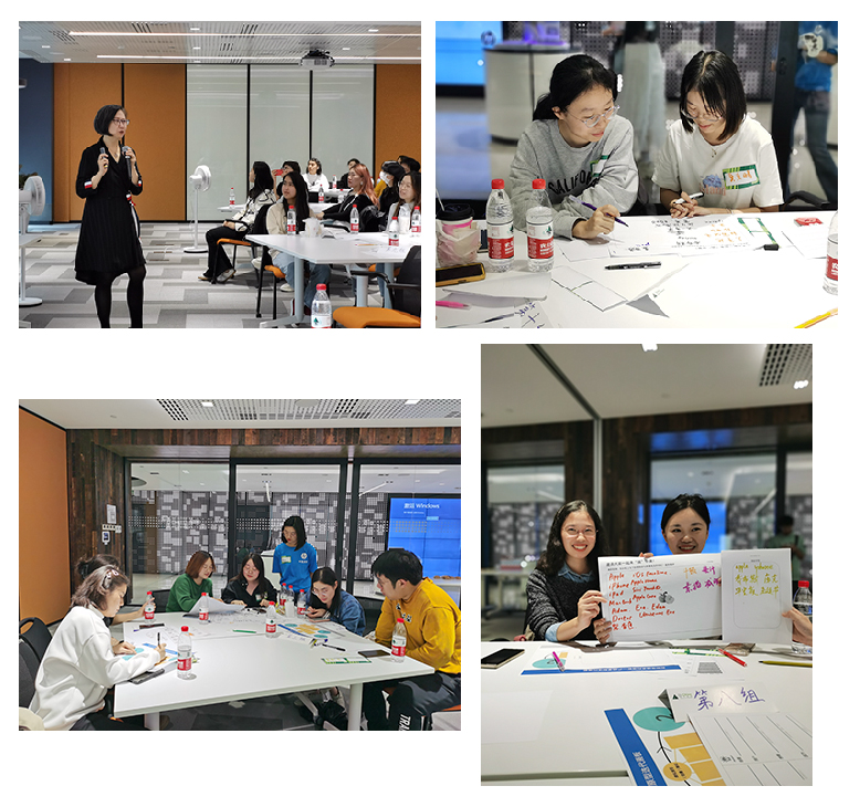 随后,在人力资源部门其他同事的带领下,同学们进行了有趣的“创客松”游戏活动,同学们在游戏环节通过头脑风暴的方式思考自己身边“最后一公里”中存在的需要解决的问题,并通过小组讨论思考出用户画像以及解决问题的创新方案。在惠普引导人的耐心引领和悉心指导下,同学们纷纷积极思考、热烈讨论,最终在纸上通过简笔画的形式展示出自己的想法和方案。在这个环节,同学们锻炼了自己的创新思维和团队合作能力,也对自己身边存在的“痛点”有了更深刻的认识。