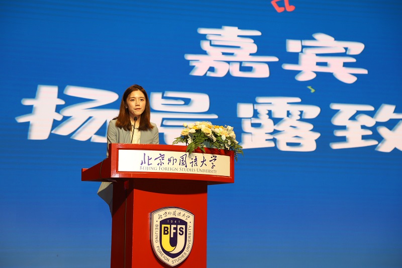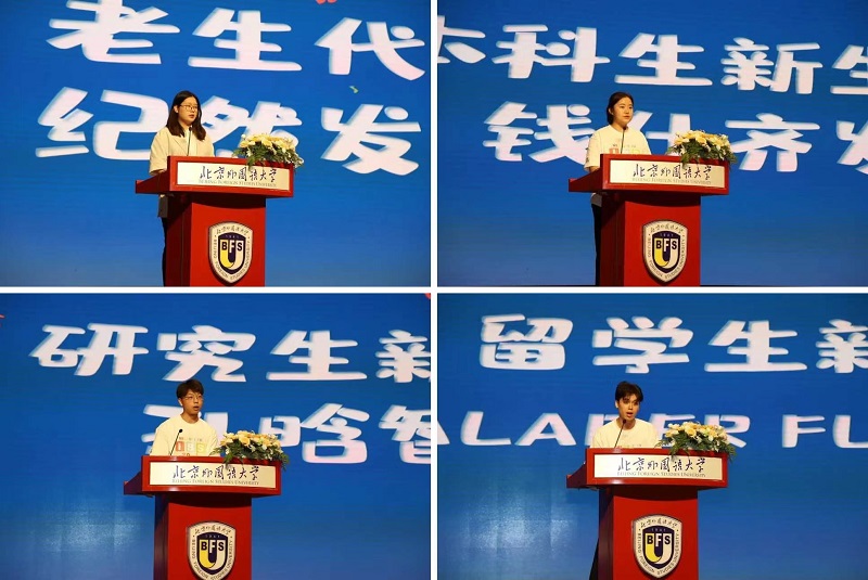 2020级本科生代表纪然、本科生新生代表钱仕齐、研究生新生代表孙晗智、职工新生代表福禄文(JALABER FLORIAN HON-CHUONG ALAIN)先后发言,他们分享经验并讲述自己与北外结缘的故事,展现了国商青年团结奋进的精神风貌。