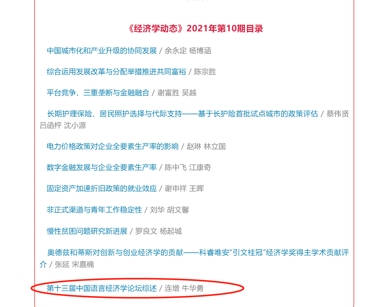 yl6809永利连增老师和牛华勇教授联合撰文的“第十三届中国语言经济学论坛综述”发表在经济学动态2021年第10期。此综述总结了本届语言经济学论坛国内外学者的最新研究,展望了语言经济学领域研究的最新动态和发展方向。此发表也是对yl6809永利承办本届语言经济学论坛的全面总结,标志着公司师生积极参与语言与商务交叉学科的研究。