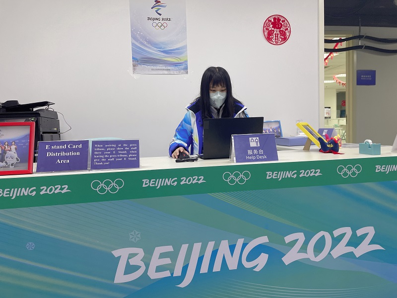 谈及在场馆的日常工作,李佳文与我们分享到:“五棵松体育馆场馆媒体中心(VMC)的新闻运行领域(PRS)主要为各国媒体提供服务。我所负责的场馆媒体中心是北京冬奥会为全球注册媒体设在场馆一线的‘阵地’,是媒体在场馆采访报道的‘大本营’,是场馆的‘聚光点’,是讲好中国故事的前线平台。”李佳文及其他志愿者的职责是为文字记者和摄影记者提供尽可能好的工作条件,以便于他们能顺利进行赛时报道工作。李佳文的日常任务是在新闻发布厅为媒体提供与运动员、教练和官员对话的机会,安排必要的口译服务及维持混合区的秩序,保证运动员能顺畅流动,从而方便运动员和媒体之间的交流。