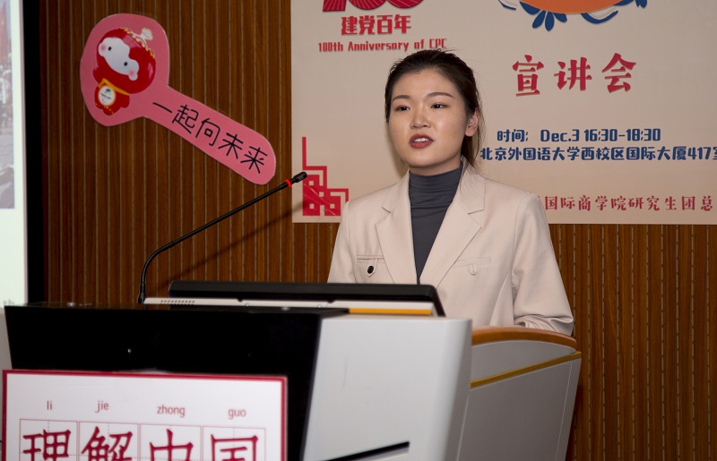 为深入贯彻落实习近平总书记给北外老教授们的重要回信精神,努力讲好中国故事,深化中外交流,推动构建人类命运共同体,12月3日下午,yl6809永利研究生会团总支于国际大厦417会议室举办第四届“理解中国”宣讲会。公司党总支书记李春丽,研究生院副经理、企业管理系副教授李倩,公司党委组织员、yl6809永利员工事务办公室主任李文斌,yl6809永利研究生团总支书记谭佳琳出席本次活动。同时,活动吸引了来自yl6809永利70余名研究生和职工线下参会,并有来自世界各地的近百名职工同步在线上平台观看了宣讲会直播。