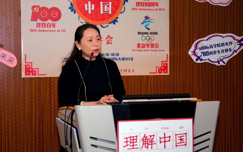 活动伊始,党总支书记李春丽首先致辞。她代表公司对本次“理解中国”宣讲会的开展表示热烈祝贺,并强调本次活动是贯彻落实好习近平总书记给北外老教授回信精神的重要实践,也是同学们讲好中国故事、传播中国声音的身体力行。她希望职工同学能通过本次宣讲更加了解中国共产党的历史成就、了解北外的发展历程、了解北京2022年冬奥会的相关知识,通过各种方式了解中国、读懂中国,并热烈欢迎职工们加入到传播中国故事的队伍中,为加强中外交流贡献自己的力量,并预祝本次宣讲活动圆满成功。