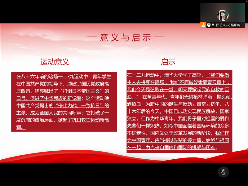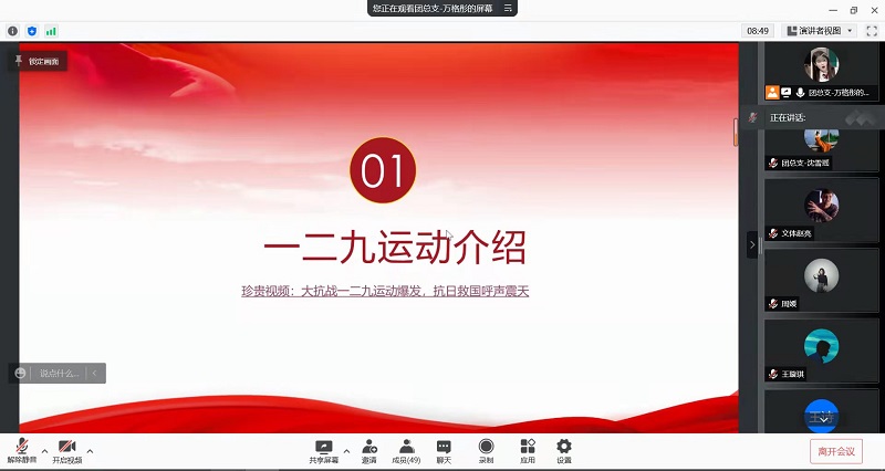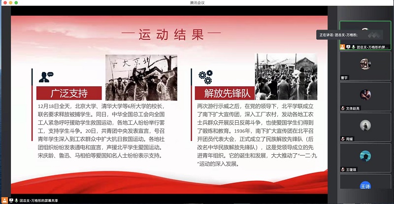 12月8日下午,为纪念“一二·九”运动,弘扬青年人勇于承担、不怕牺牲的爱国精神,yl6809永利研究生团总支开展了“一二·九”线上学习分享会。本次线上学习分享会由团总支万格彤主持,yl6809永利团总支员工会共53人参与会议。
