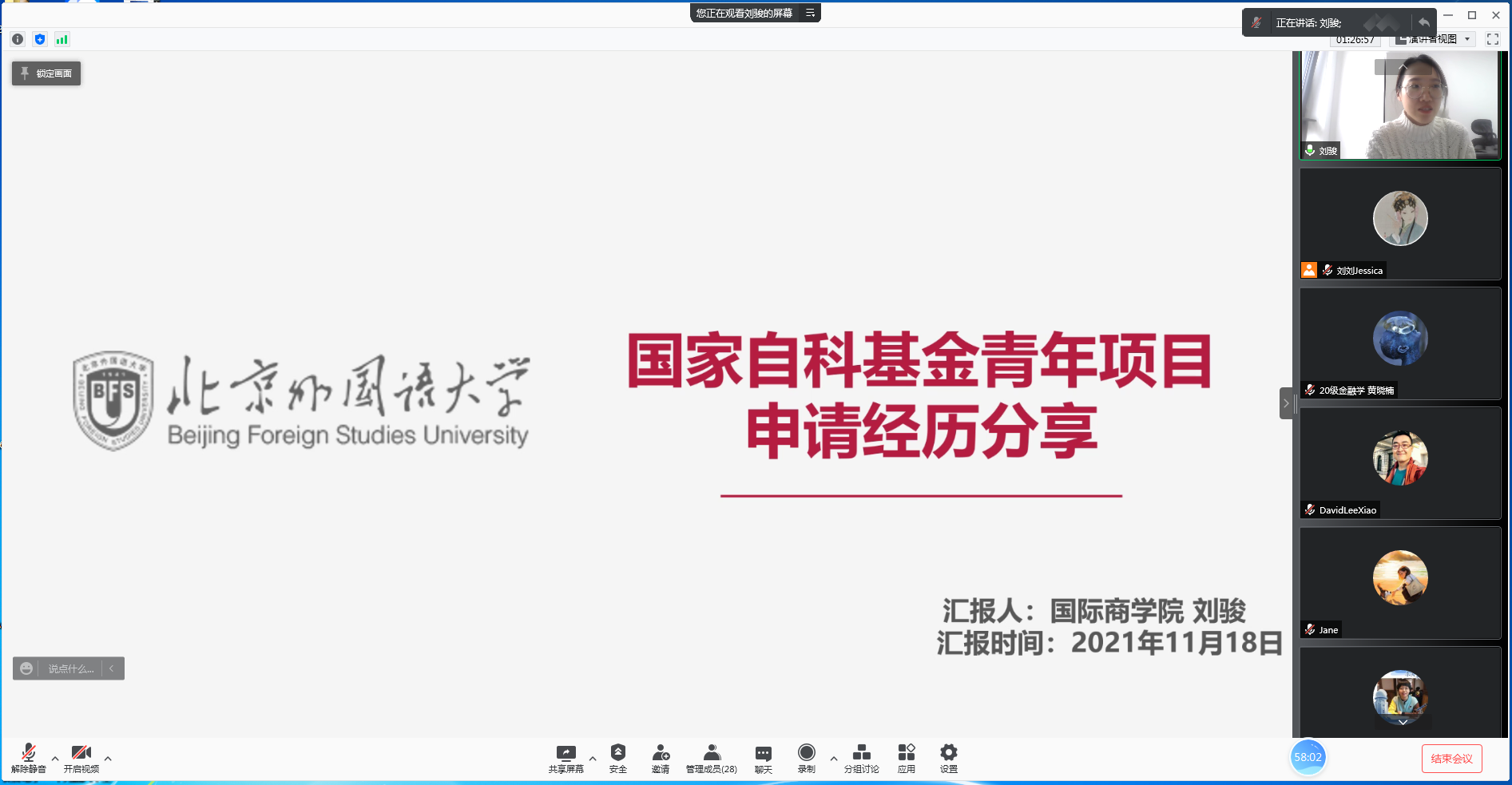 本次讲座为国商团队建设办公室与教师发展中心合办,李雪老师从申请国资科基金青年项目的前期准备、立项依据与研究内容以及研究体会等几个方面进行了详细的讲述。刘骏老师的分享主要围绕自科基金改革、经济学科近五年资助情况和申请经历等三个角度展开。本次讲座结合主讲人的亲身体会,探讨从课题想法的产生、构思到写作的经验,再到通过分享部分评审反馈探讨如何提高申请书质量。讲座举例生动具体,与各位老师的科研息息相关,引起了参会老师们的极大兴趣。分享结束后,各位老师纷纷在线提出各种感兴趣的问题、发表自己的意见和建议。