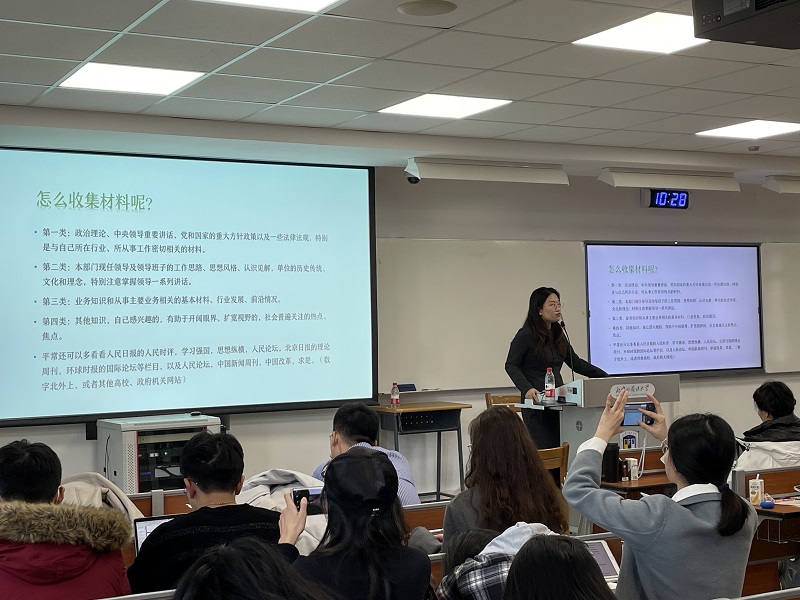 在讲座最后,谭佳琳向同学们传递了成为“写手”的重要经验——学习与练习,即要做到“多读、多看、多想、多学习”,也要带着思考的深入学习。她建议同学们在学习工作之余,多看新闻联播、多阅读思政教育领域及其他高校的公众号,从各个角度学习和收集材料,从模仿借鉴做起,积累写作经验、提升写作能力,全面增强自己的求职竞争力。