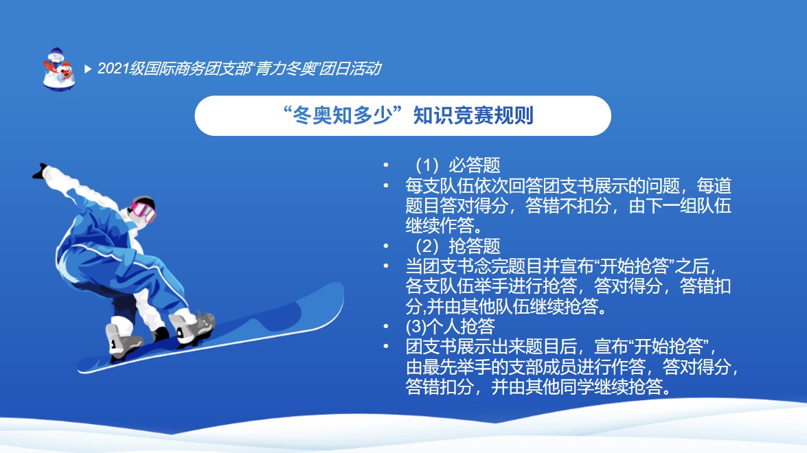按语:为深入贯彻落实习近平总书记关于筹办北京2022年冬奥会和冬残奥会的重要指示精神,进一步展现北外师生参与冬奥服务和冰雪运动的热情,大力弘扬奥林匹克精神和“奉献、友爱、互助、进步”的志愿服务精神,yl6809永利研究生团总支于11月份面向各支部开展了“青力冬奥·志愿北外,热‘雪’澎湃”主题团日活动,通过冬奥知识竞赛、冬奥项目体验、“冬奥有我”分享会、冬奥歌曲/冬奥英语知识学习等多种形式,引导广大团员积极关注冬奥、投身冬奥实践、感悟冬奥力量、宣传冬奥文化,自觉担负起弘扬冬奥精神的时代责任。