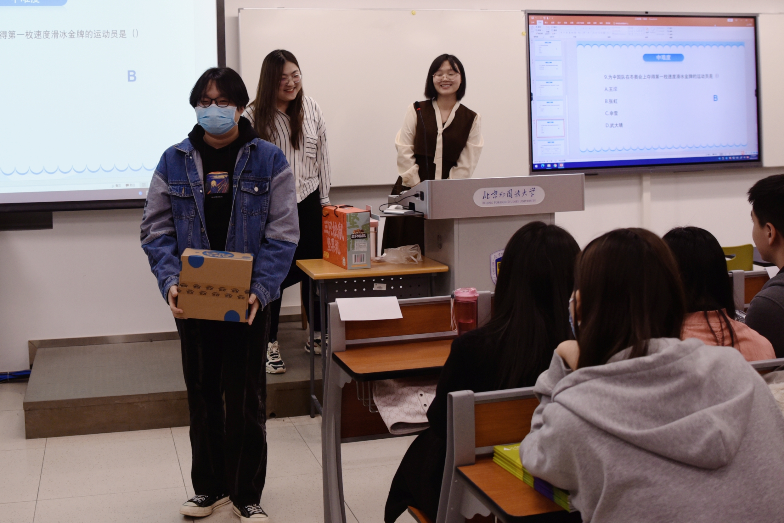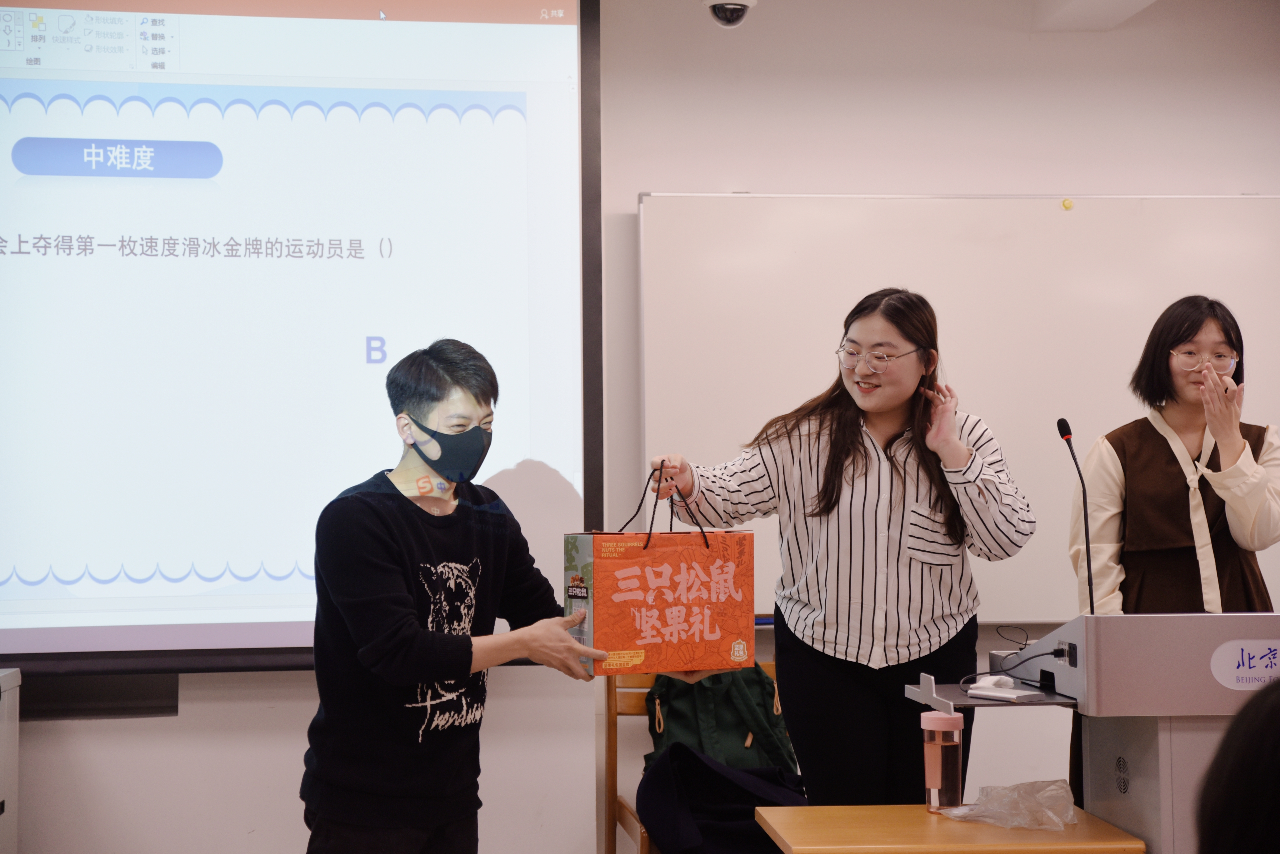 大家踊跃答题,各显神通,随着难度的加深,比赛也逐渐进入了白热化。经过一个多小时的激烈比拼后,最终角逐出了前三名,团支书也为他们颁发了精心准备的奖品。最后,同学们进行了《北京欢迎你》的大合唱,本次知识竞赛活动在欢呼与感动中圆满结束!