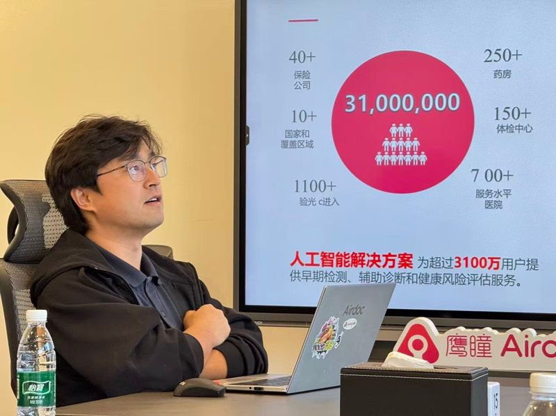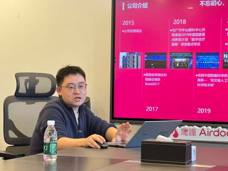 抵达企业后,鹰瞳科技海外业务负责人李超就公司海外战略布局进行详细分享。作为全球视网膜影像人工智能领域的标杆企业,鹰瞳科技依托自研软硬件+AI一体化方案,打造了覆盖慢性病早筛、眼健康管理的多元产品体系。目前,公司产品已覆盖全球23个国家及地区,服务超3500万人,正聚焦东南亚市场持续推进出海战略,以高性价比优势推动海外医疗设备迭代升级。
