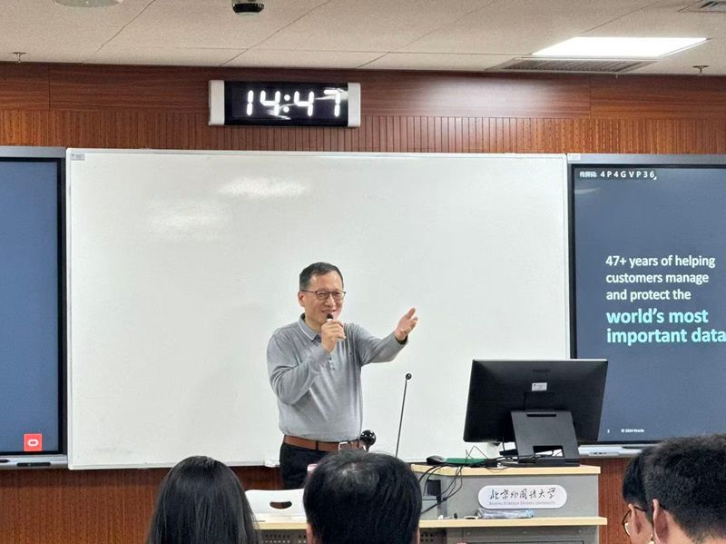 苏冬林以《Oracle在AI数据的发展》为题进行分享。他从甲骨文47年的行业深耕历程说起,讲述这家传统数据库龙头在大数据时代冲击下,凭借自我革新转型AI赛道的“逆袭故事”,其“All in AI”战略核心——不盲目跟风自研大模型,而是打造集成主流大模型的多模型平台,为企业提供灵活适配的解决方案,引发学子关注。他重点拆解了甲骨文的技术创新:自治式数据库通过嵌入机器学习算法实现自我优化、修复与维护,大幅降低人力成本;融合数据库则打破数据壁垒,实现关系型与非关系型数据的一体化存储,适配大数据时代多元需求。针对北外学子的特点,苏冬林特别强调,AI技术正让“跨界”变得更简单。甲骨文全新AI Data Platform不仅能整合企业级核心数据、提供合规保障,更支持自然语言交互,无需深耕代码就能通过简单操作查询数据、生成报表。他鼓励同学们抓住机遇,借助这类智能化工具缩短成长周期,将语言优势与数据思维结合,在出海企业服务、跨文化数据应用等领域挖掘自身价值。