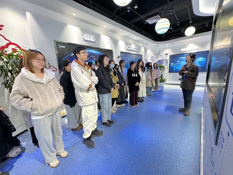 抵达企业后,同学们首先在工作人员的引导下参观了安恒信息安全创新体验中心,从关键信息基础设施防护到民生数据安全保障等多个维度,直观感受到网络安全技术在现实生活中的重要作用。