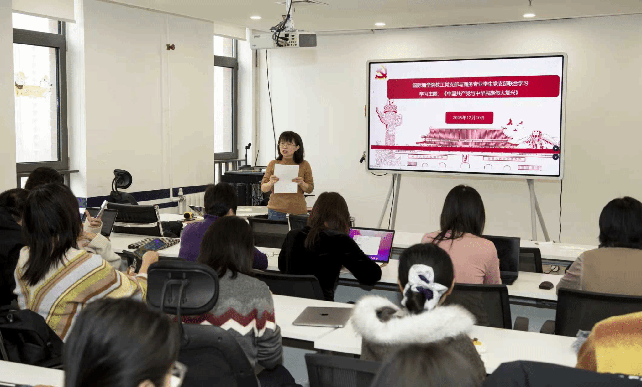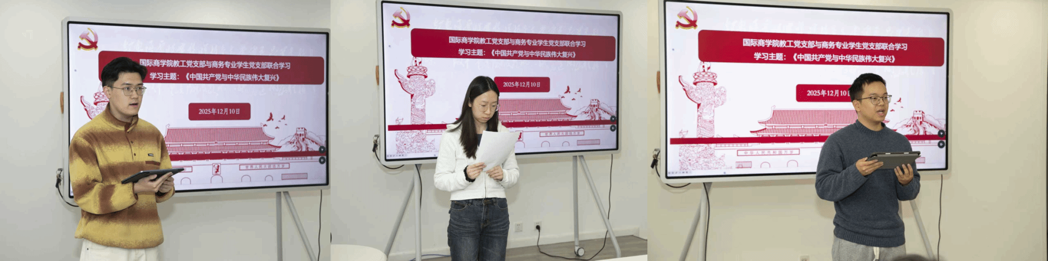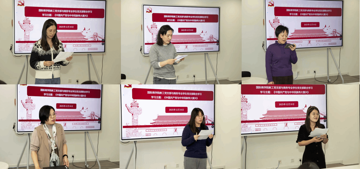 商务员工支部党员郁博超、胡嘉欢、倪昊天结合集中培训内容与国际商务专业特色各抒己见,重点围绕“党的自我革命”与“全面从严治党”思考制度建设对于经济发展的核心作用;围绕“对外开放”讨论如何服务企业“引进来”与“走出去”,重塑全球贸易形态;围绕“中国式现代化”和“新质生产力”讨论企业如何拥抱技术变革、实现数字化转型与可持续发展。