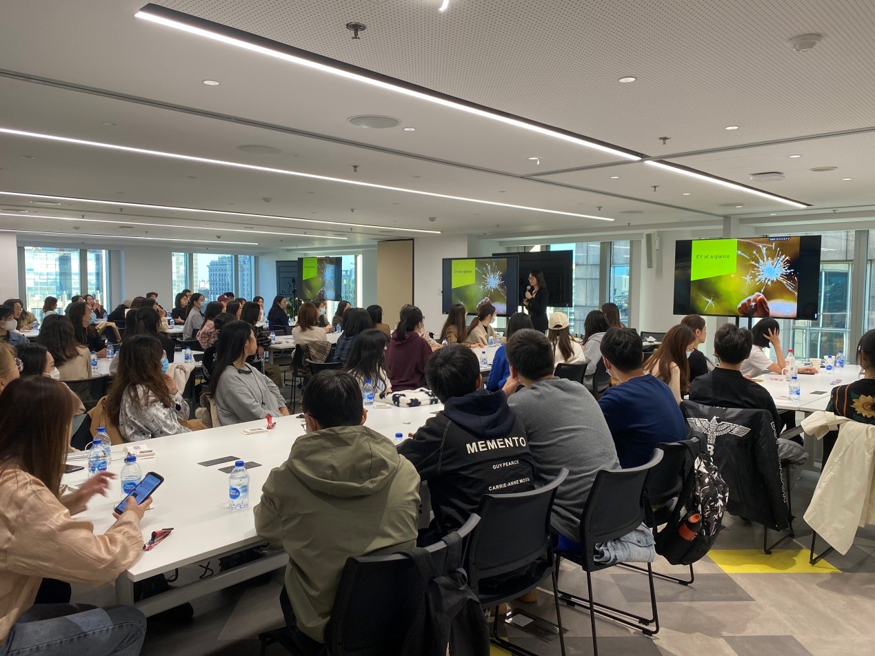 在观看了安永宣传短片后,审计合伙人Grace为大家介绍了安永全球、安永大陆地区和安永北京的具体情况,从客户群体、业务范围、分所分布、员工规模、执证人员数量等多方面进行了详细讲解。